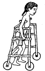 | CAUTION: Sitting walkers should usually be used, if at all, as an early and temporary step toward walking. With them, the child does not learn to balance well and the hips are often at an angle which can form contractures (see Chapter 8, Page 86). |